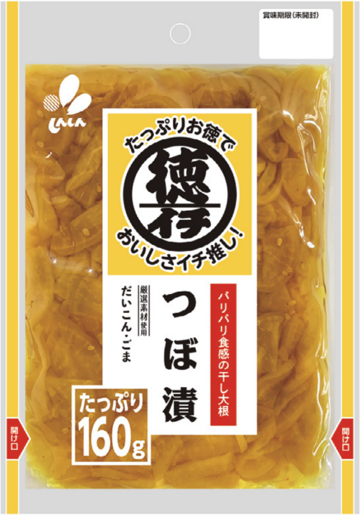 たっぷりお徳で、おいしいお漬物の「徳イチ」シリーズのつぼ漬です。歯切れがよく芳醇な香りの干し大根を使用し、まろやかな甘さに仕上げました。