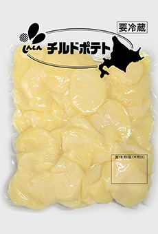 北海道のじゃがいもの皮をむき、ボイルして真空パックした製品で、スライスカットにしています。