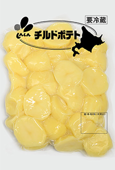 北海道のじゃがいもの皮をむき、ボイルして真空パックした製品で、1/2カットにしています。