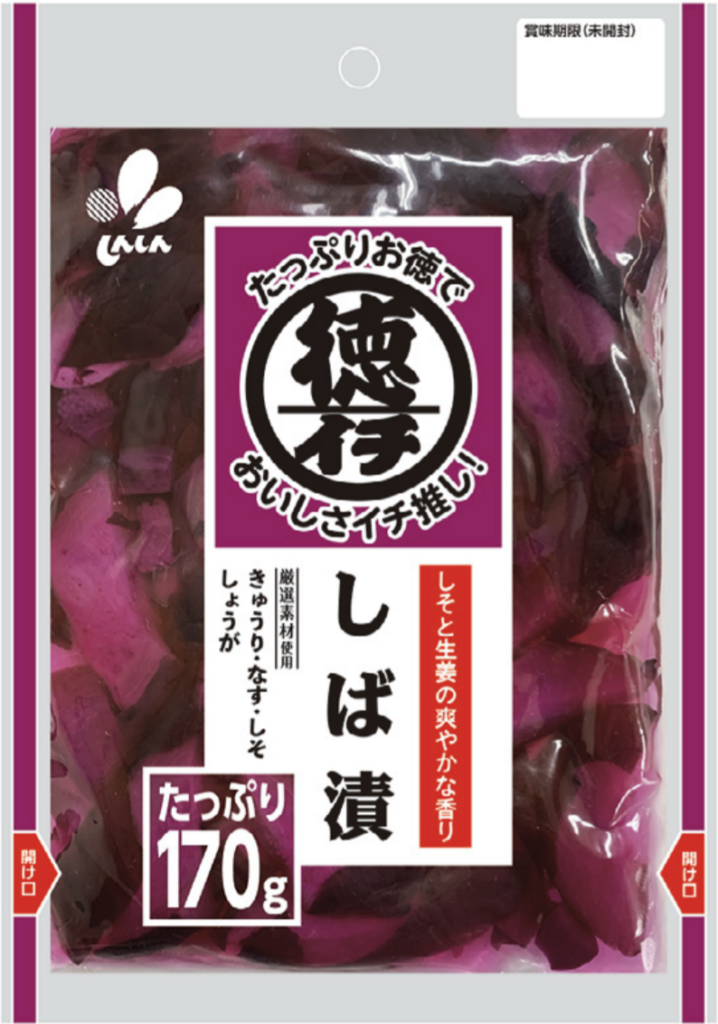たっぷりお徳で、おいしいお漬物の「徳イチ」シリーズのしば漬です。厳選したきゅうりとなすを食べ応えのあるサイズにカットし、香り高いしそとしょうがを加えてさっぱりと漬け上げました。