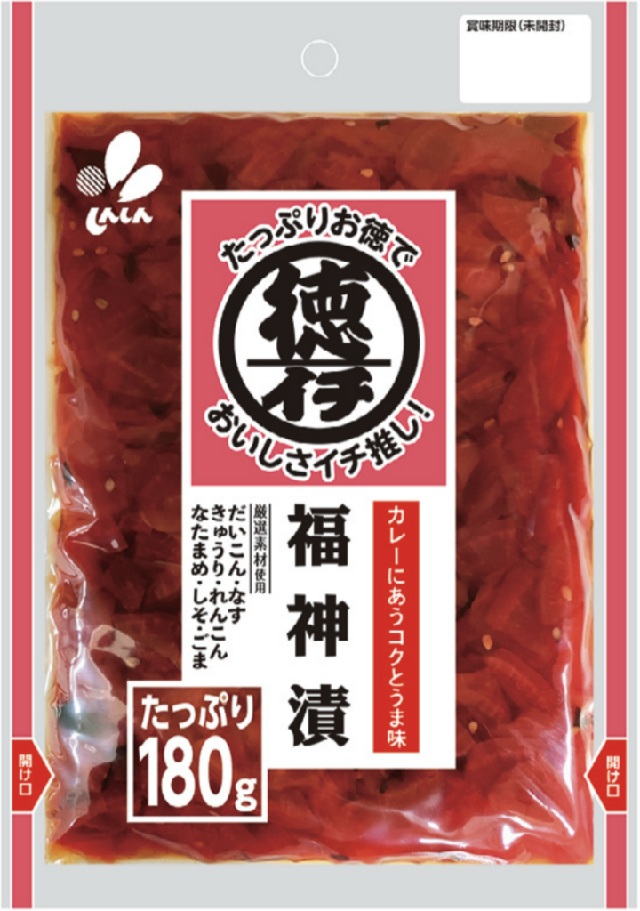 たっぷりお徳で、おいしいお漬物の「徳イチ」シリーズの福神漬です。7種の厳選素材を使用し様々な食感が楽しめ、まろやかな甘さとうま味がカレーによくあいます。