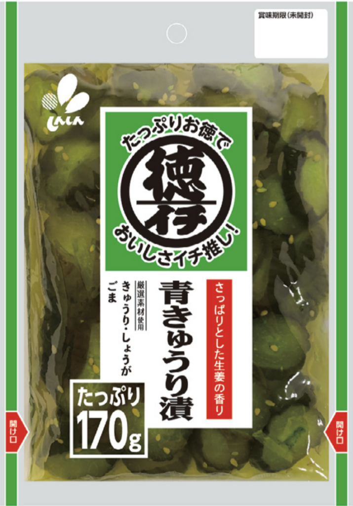 たっぷりお徳で、おいしいお漬物の「徳イチ」シリーズの青きゅうり漬です。厳選したきゅうりを食べ応えのあるサイズにカットし、香り高いしょうがとごまを加え、さっぱりと風味豊かに仕上げました。