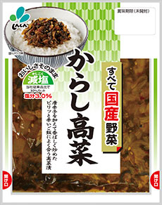 すべて国産野菜を使用し、おいしさはそのままで塩分30%カットしました。(当社従来品からし高菜対比) 保存料や着色料は使用しておりません