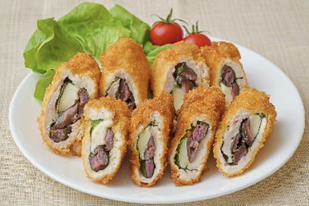 ④薄力粉、溶き卵、パン粉の順番に衣をつけ、約170度に熱した油で両面がキツネ色になるまで揚げて完成。