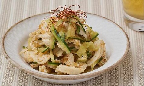 1.鶏ささみは筋を取り、酒と塩をかけ、電子レンジで3分加熱し、粗熱をとりほぐす。