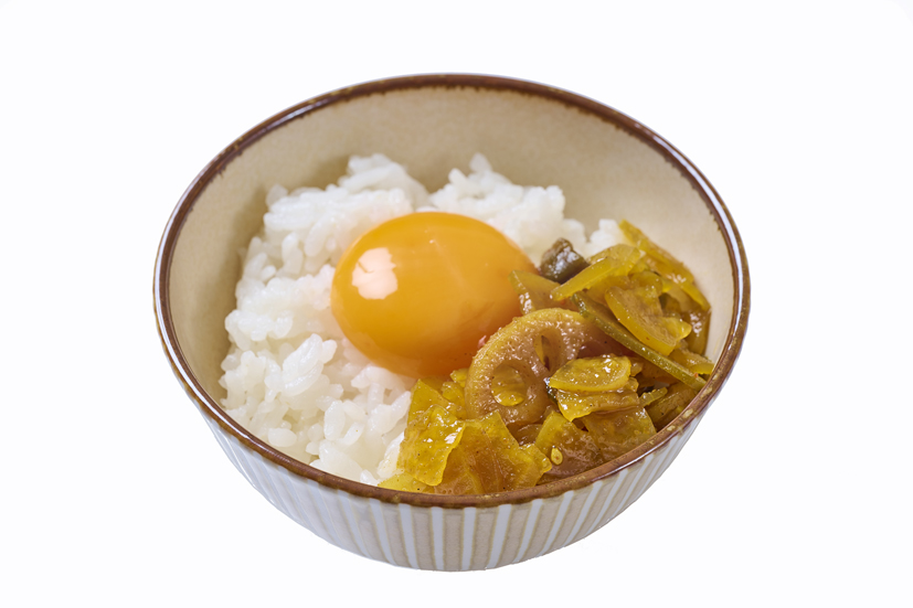 ご飯にカレー甘辛漬と卵を混ぜ合わせる。