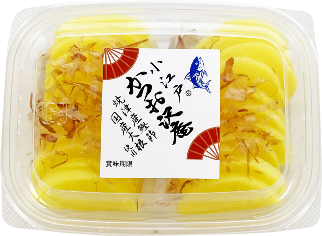 焼津産かつお節がたっぷりとふりかけた手作りのスライスたくあんです。